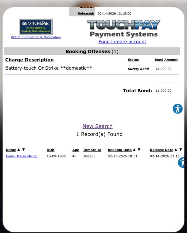 Les registres de détention indiquent que le musicien, identifié dans les documents sous le nom de Emile Pierre Michel, a été admis au centre de détention à 18 h 51. Il a ensuite été libéré le 14 février 2026 à 13 h 15, après les premières procédures judiciaires.